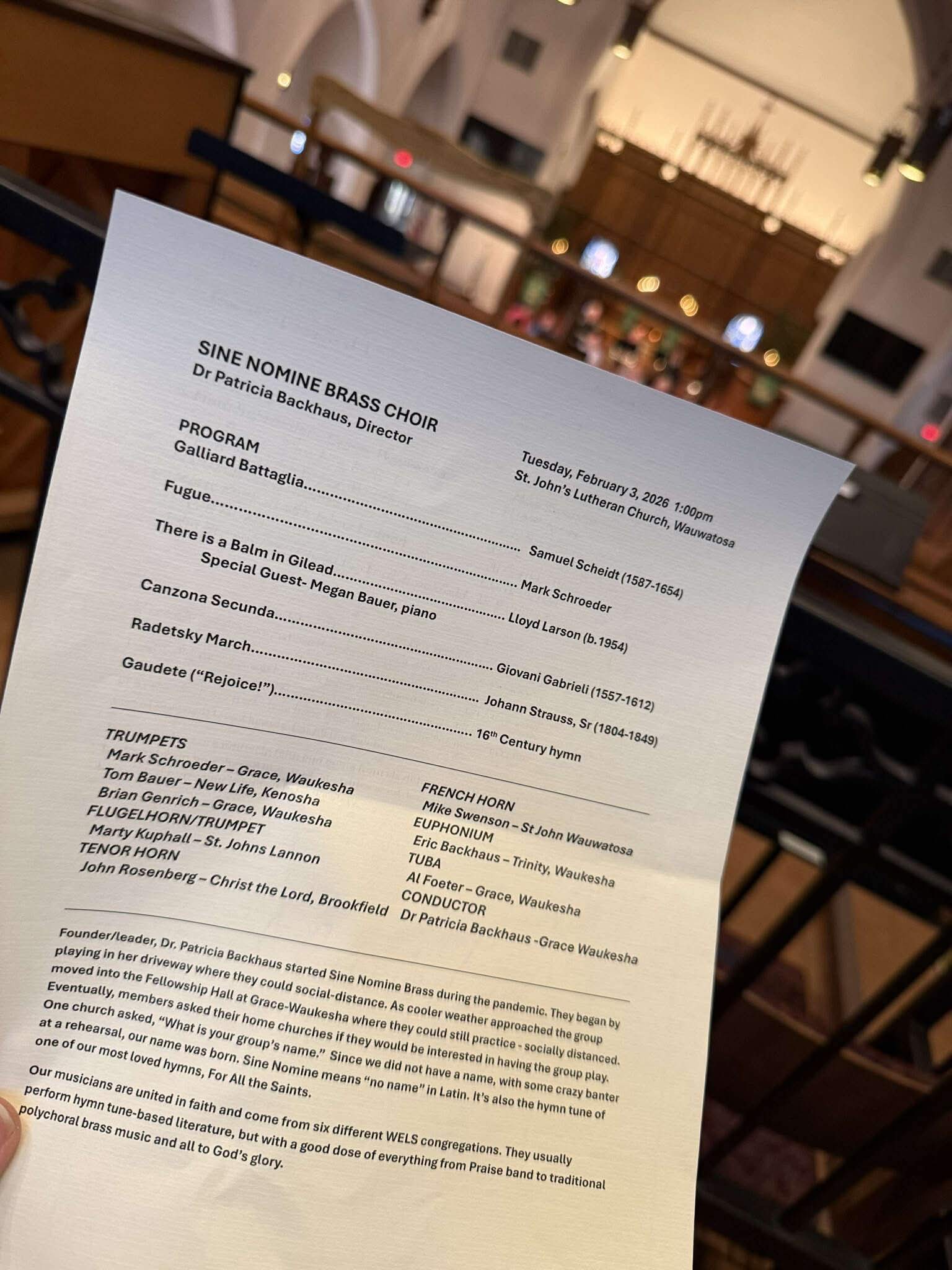 In 2020 seven friends met in Pat’s Waukesha, WI. driveway to play for the sheer joy of playing. They now number ten brass musicians from multiple churches who travel around the area to WELS churches playing for worship services. They never planned to have a name – thus, Sine Nomine – without name.